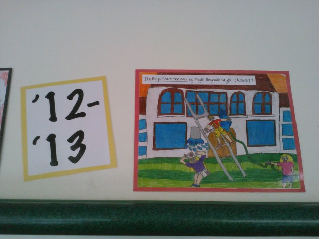 Hopefully you can see it up there–up near the ceiling. Images taken from each book we read during our year together, chosen by the class as a whole.