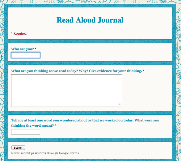 Another thing that we now have in an electronic format is our Read Aloud Journals. While we will not always complete them online (it’s not the best platform for every learner, nor can you record images you’re having while we read), it’s a great way for me to do check-ins and get a picture of what is going on in their heads during our Read Aloud time. Kids love this one, too! Plus, it’s just cute. But not that that would ever by why I would do something. 🙂
