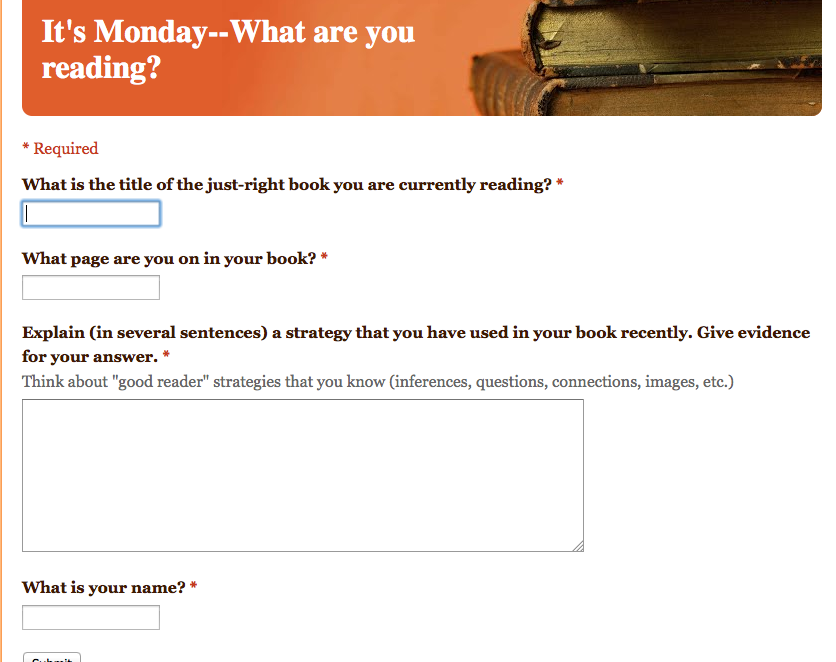6. We now have a way to do two more new things that are a part of our normal routine in a more efficient (and more motivating for some) way. I have been wanting to look into using Google Docs and Google Forms for a while now, and I finally found a reason to do so! On Mondays, we do something called It’s Monday, What Are You Reading? (which I stole from some way-smarter-than-me people I connect with on Twitter), which is essentially just a way for readers to share with me and each other what they are reading and what page they are on. I can then use that list to keep track of what readers are doing, and address needs that may arise. We used to do it on a checklist that I keep, but now, using a QR code that sends them right to the link, kiddos do it on their own and send me the info!