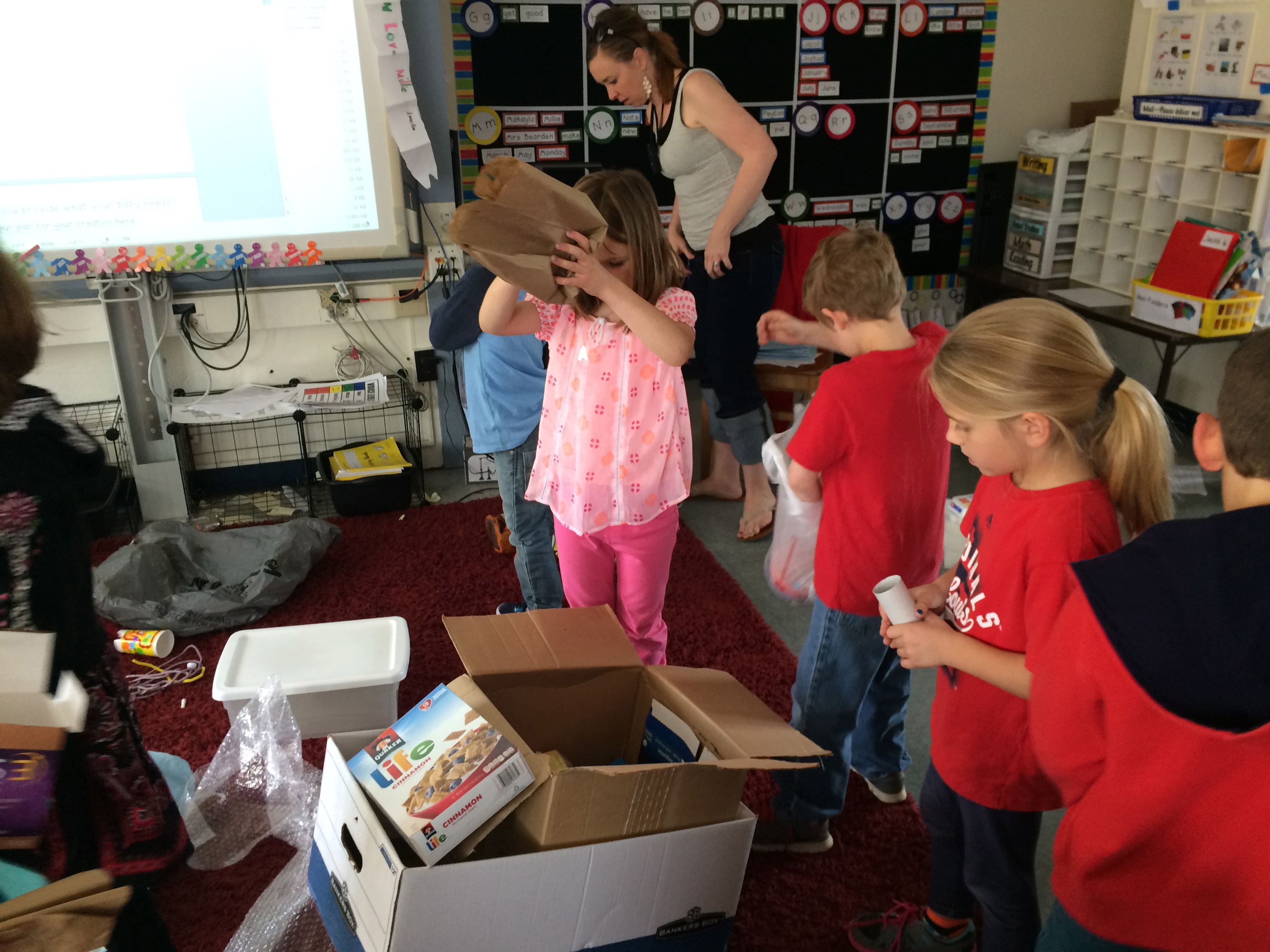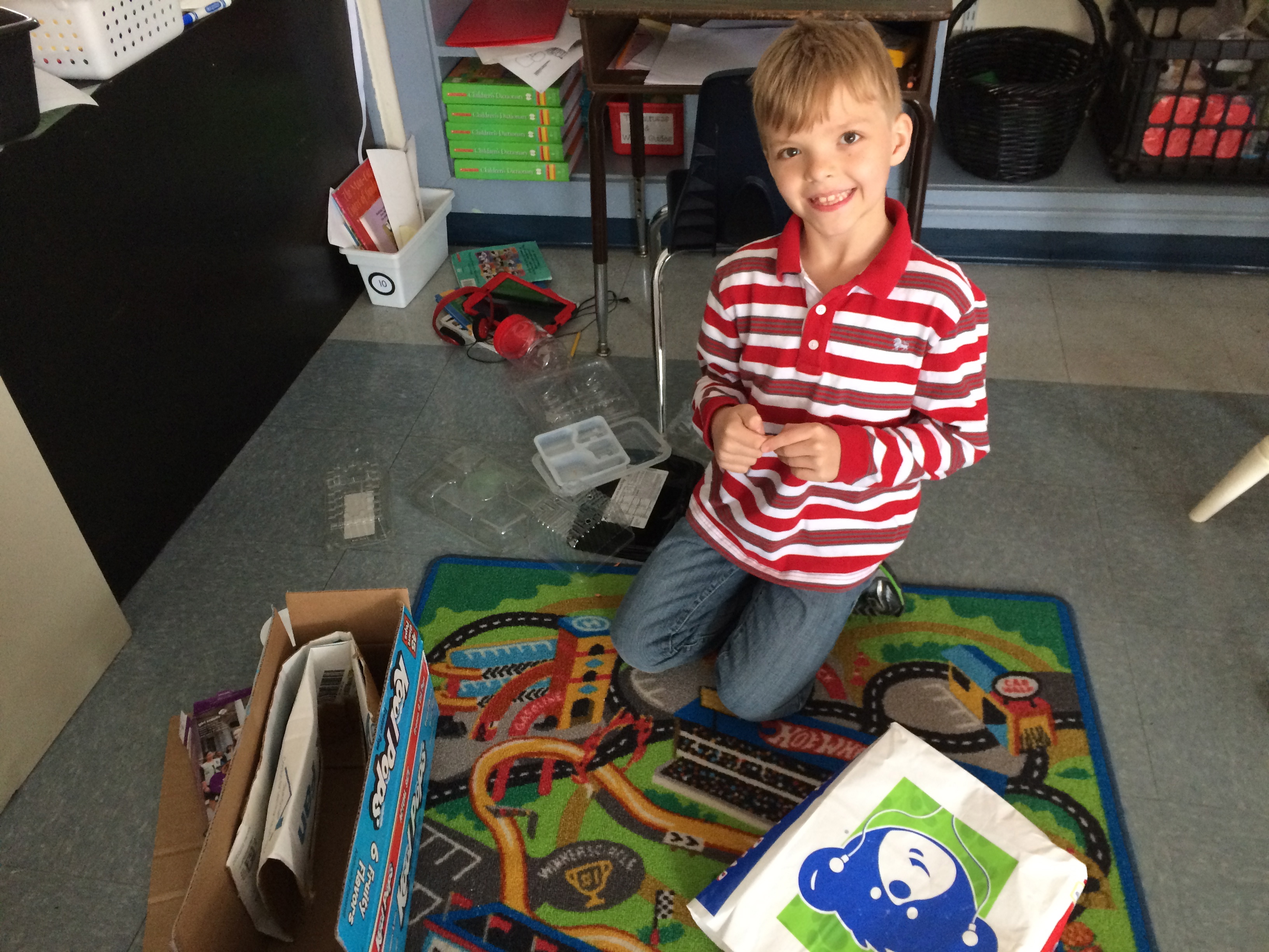 After the story, I gave them the directions. They were to build something that would help them “go places,” using a kit that everyone would get (like in the story). We didn’t talk a lot about what to do or how to do it (because they were so excited and wanted to get busy right away!), but they automatically started looking for partners (again, like they did in the story). And EVERYONE ended up with someone else with which to share both their supplies and their ideas!