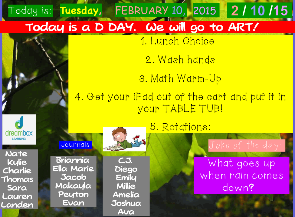 Ok, so this may not end up being a weekly thing like math warm-ups, and it might not be anything that people even want to read, but for those that do–here you go! Last week I FINALLY got to participate in #1stchat on Twitter. I have wanted to “attend” all year, but the timing had proven to be a really hard one for me to be at my computer (it’s 7 CT on Sunday nights–bedtime!!). For whatever reason, it worked out for me and boy was I SUPER excited to have been able to learn and grow with my #1stchat friends! The topics were many, but one theme that came up was Morning Meeting and how we use this tool to set the stage for a positive learning day. One thing I shared was the in our class we do a joke of the day. It is just a part of the morning welcome screen I have up on the ActivBoard when my firsties come in, and has easily become part of the routine.