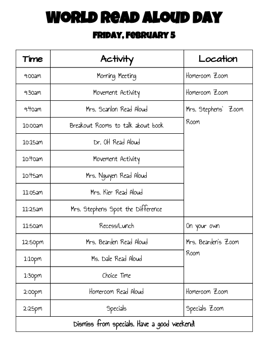 So we sat down as a team before the day, finding times for all of our 2nd grade teachers, plus Mrs. Scanlon–our fabulous reading teacher–and Dr. OH–our fabulous principal–to read to our kiddos. Like a normal virtual day, we also tried to make sure we added in movement breaks and times for kids to interact and talk to each other. Our plan looked like this: